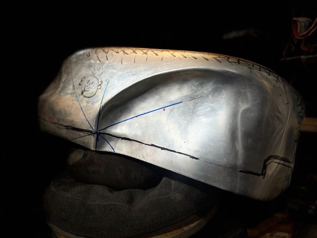Arbeidet med tanken tråkler seg framover. Topp-plate og bunn-plate nærmer seg. Blir utrolig spennende å se når delene settes sammen, og det nærmer seg et slutt-produkt. Når det gjelder motoren så håper jeg alt er på stell. Det vet man vel ikke før den er kjørt en stund. Toine lovet å oppdatere flittig underveis med bilder. Det har han ikke gjort. Når motoren var ferdig fikk jeg noen bilder, og legger da merker til at noe er feil. Jeg hadde på forhånd slipt vekk litt av noen kjøleribber på bakre sylinder for å få god nok klaring mot ramma. Men på den ferdige motoren var plutselig den ene kjøleribba hel igjen…?! Etter noe tenking kommer jeg til at den øverste ribba «på sylinderen» hører til toppen, og det er den som nå er hel. (Kan sees på første bilde i forrige innlegg). Toine har altså byttet toppene mine med noen andre. Kanskje bra, kanskje dårlig - antagelig har det ikke noe å si. Men jeg får en følelse av at det går litt fort. Han har nå slipt vekk, og lakkert på nytt, så da passer den vel i ramma når den kommer hjem en gang i vinter.