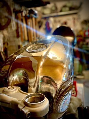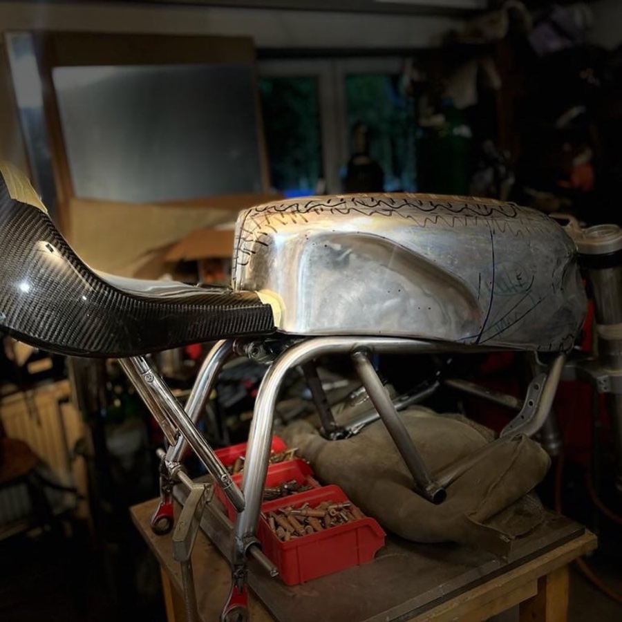Nå er tank og motor trygt på plass her hjemme. Jeg er temmelig fornøyd, men lider dessverre under å stille høye krav til det meste - meg selv inkludert. Da blir man sjelden helt fornøyd, og ofte litt skuffet. Motoren ser fin ut, og ettersom det ikke ble noen oppfølgende bilder fra prosessen hos Biggelaar, vet jeg ikke mer om innmaten enn det han har fortalt. Det stemmer sikkert, men han skuffet litt underveis i prosessen. Han virker bare opptatt av klatring med datteren for tiden. Når jeg hentet motoren lå han flat med ødelagt rygg. Jeg fikk hjelp av en annen kar som virket flink. Han har arbeidet som mekaniker på et team i IDM (det tyske roadracing mesterskapet) i en årrekke. Jeg fikk tips om første oppstart av motor. Aller første gang skal motor dras på starter uten plugger satt inn, til oljetrykk-lampen slutter å lyse. Så er det i med plugger og vanlig start. Dette er for å beskytte lager fra første harde påkjenning. Han mener man kan ødelegge motoren allerede der, hvis man ikke gjør det riktig. Forøvrig en hyggelig og dyktig kar som hjalp meg å montere slipper-clutch når jeg hentet motoren. Når det gjelder tanken er jeg ganske fornøyd, men heller her er jeg ikke helt i mål. Det er bare å innse at det alltid er rom for å gjøre ting bedre. Norbert er en usedvanlig hyggelig kar, og på mange måter svært dyktig. Men han lider nok ikke under perfeksjonistens åk. Det er noen detaljer som ikke ble så bra som jeg håpet, men innen jeg oppdaget dette var vi kommet så langt i prosessen at det ville blitt uforholdsmessig mye arbeid å gjøre om på ting. Da ville tanken måtte deles opp og fryktelig mye gjøres på nytt. «Problemet» handler om finish på noen områder som ikke synes så veldig godt, helt foran på tanken, og litt slurv i «linjene» nederst på tanken. Men jeg innser at når man ikke gjør alt selv, og heller ikke kan være til stede under prosessen og følge opp, så blir det sånn. Totalt sett er jeg fornøyd. Tanken er trykktestet, og skal poleres opp etter alle kunstens regler, til den skinner om kapp med felgene. Så skal det noe dekor på plass etterhvert. Tanklokket skal «trimmes» så det ventilerer litt før jeg monterer det. Under er det gjort klart for å montere original bensinpumpe innvendig. Når det gjelder feste av tank mot ramme, er det laget to festepunkt i tanken. Ett foran og ett bak. Nå må jeg finne opp noen braketter som gjør festingen enkel og ikke minst diskret.