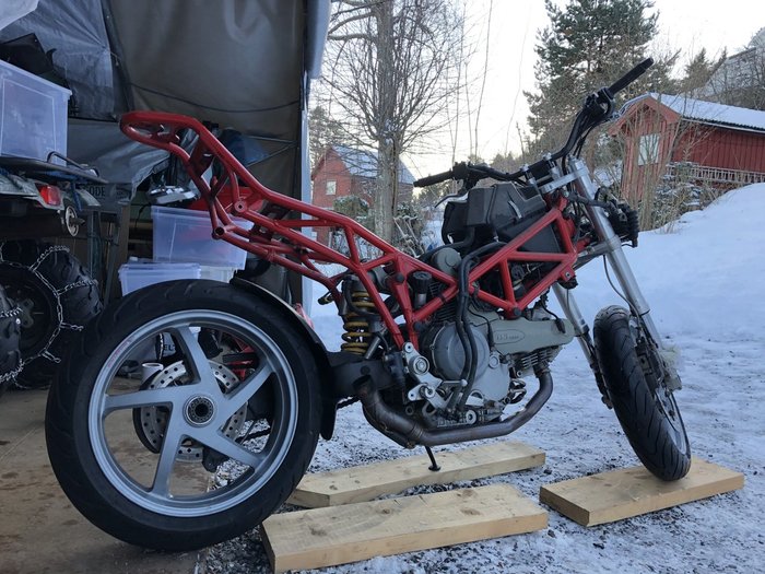 Veien til å få geodkjent en hjemmelaget ramme er ikke helt klar enda, men jeg kaster meg nå ut i tåka - full av optimisme og pågangsmot. Har alt for mange tanker i hodet om hvordan det skal bli, så dette er et prosjekt som kommer til å utvikle seg litt etterhvert. Men jeg starter med en 2003 mod Multistrada. I dag var jeg på biltilsynet for å vise den, og levere søknad om ombygging. Fant da ut at jeg allerede har hatt litt flaks. Det viser seg at det er VELDIG viktig å begynne med en sykkel som er registrert før 17 juni 2003. Etter denne datoen må alle endringer dokumenteres etter eu direktiv (97/24EF). Biltilsynet sier da at f.eks. en bensintank i annet materiale enn stål må da  testes av et godkjent laboratorium.... Min sykkel er reg første gang litt tidligere det året, så da blir det enklere. E-merking av utstyr er alfa og omega. Men et eksosanlegg KAN visstnok også gå gjennom med en skikkelig lydmåling.