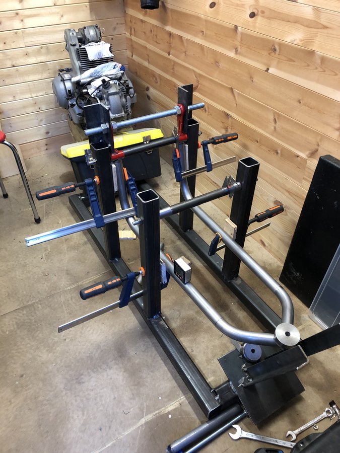 Ny stor dag i dag. Hoveddelen av ramma er nå punktet sammen og tatt ut av jiggen for første gang. Test på motor gikk ganske bra. Litt trangt et par steder, men ikke noe vinkelsliperen ikke fikser 🙂